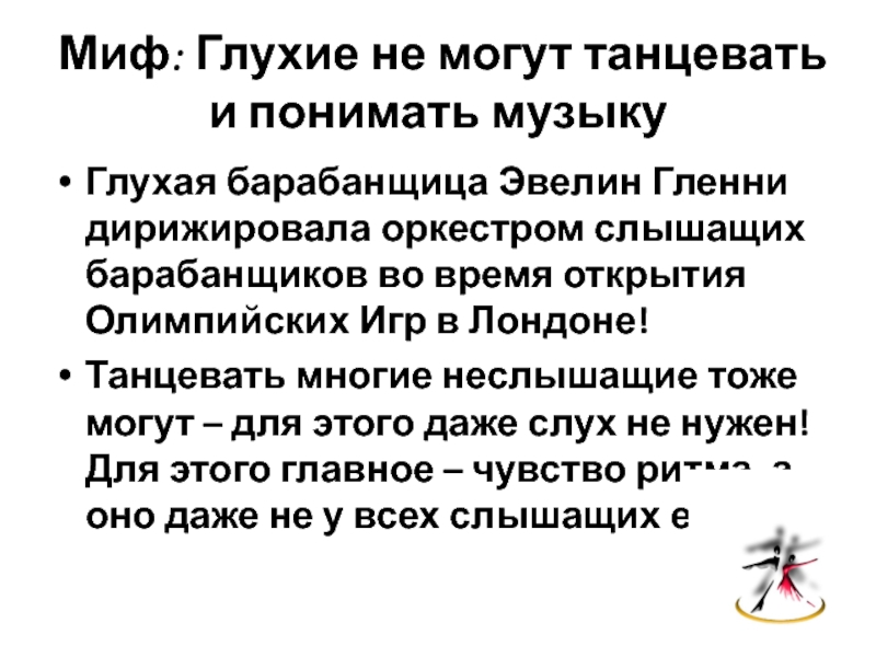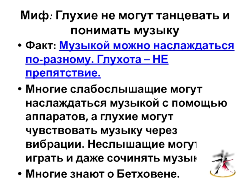 Миф: Глухие не могут танцевать и понимать музыку Факт: Музыкой можно наслаждаться по-разному. Глухота – НЕ препятствие. Многие