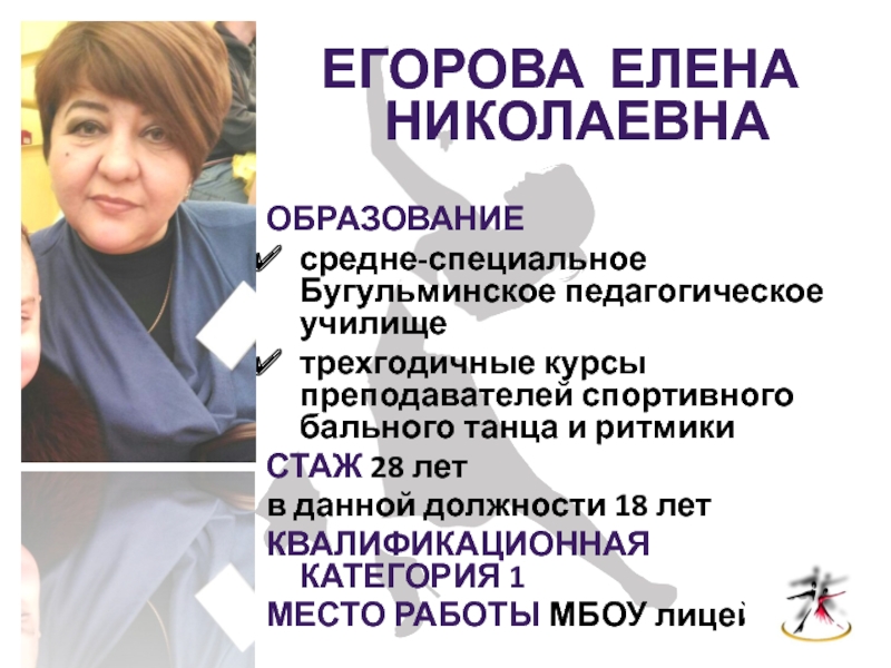 ЕГОРОВА ЕЛЕНА НИКОЛАЕВНАОбразование средне-специальное Бугульминское педагогическое училищетрехгодичные курсы преподавателей спортивного бального танца и