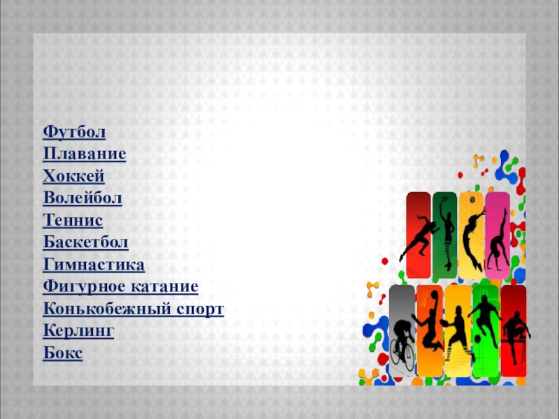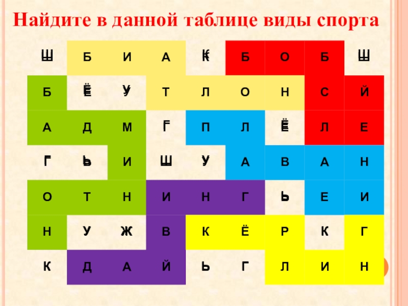 Слайд 26Найдите в данной таблице виды спорта
