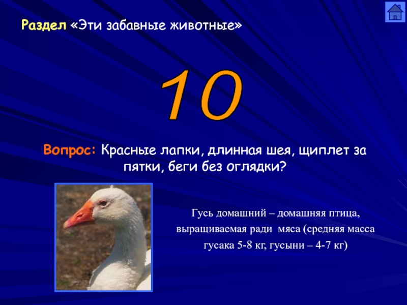 Гусь домашний – домашняя птица, выращиваемая ради мяса (средняя масса гусака 5-8 кг, гусыни – 4-7 кг)