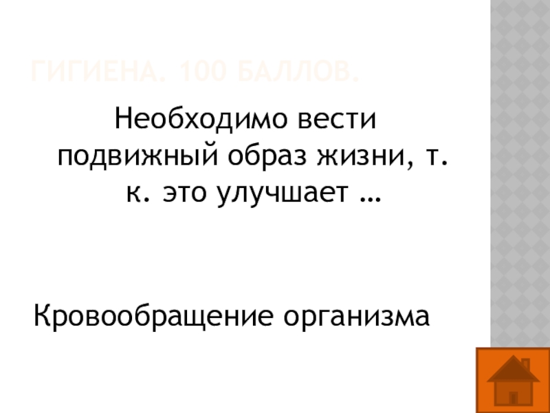 ГИГИЕНА. 100 БАЛЛОВ.Необходимо вести подвижный образ жизни, т.к. это улучшает … Кровообращение организма