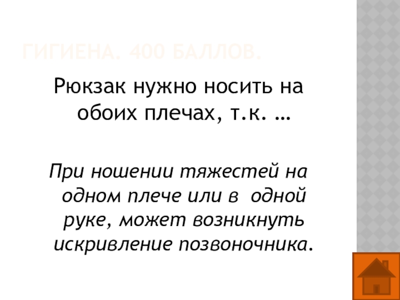 ГИГИЕНА. 400 БАЛЛОВ.Рюкзак нужно носить на обоих плечах, т.к. …При ношении тяжестей на одном плече или в