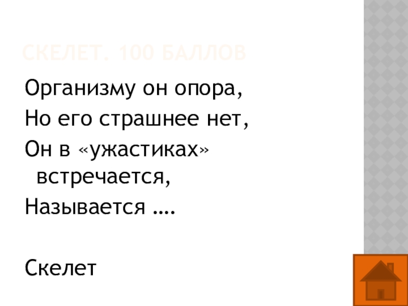 СКЕЛЕТ. 100 БАЛЛОВОрганизму он опора,Но его страшнее нет,Он в «ужастиках» встречается,Называется ….Скелет