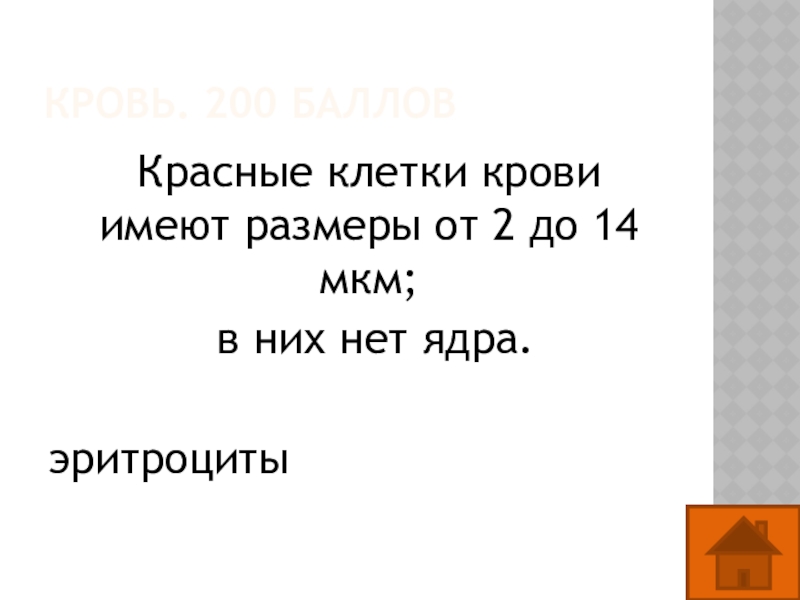 КРОВЬ. 200 БАЛЛОВ Красные клетки крови имеют размеры от 2 до 14 мкм;  в них нет
