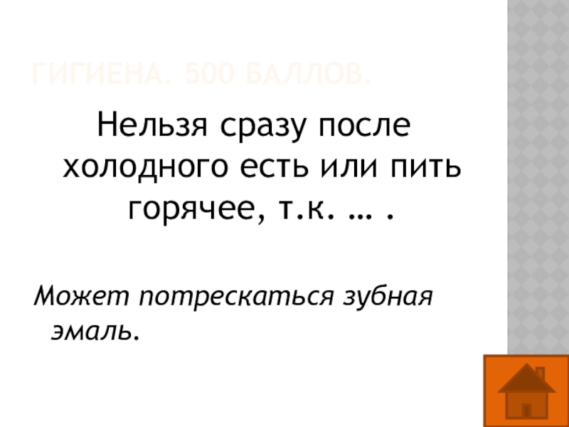 ГИГИЕНА. 500 БАЛЛОВ.Нельзя сразу после холодного есть или пить горячее, т.к. … .Может потрескаться зубная эмаль.