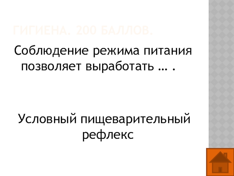 ГИГИЕНА. 200 БАЛЛОВ.Соблюдение режима питания позволяет выработать … .Условный пищеварительный рефлекс