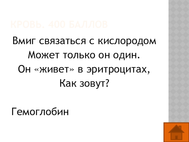 КРОВЬ. 400 БАЛЛОВВмиг связаться с кислородомМожет только он один.Он «живет» в эритроцитах,Как зовут?Гемоглобин