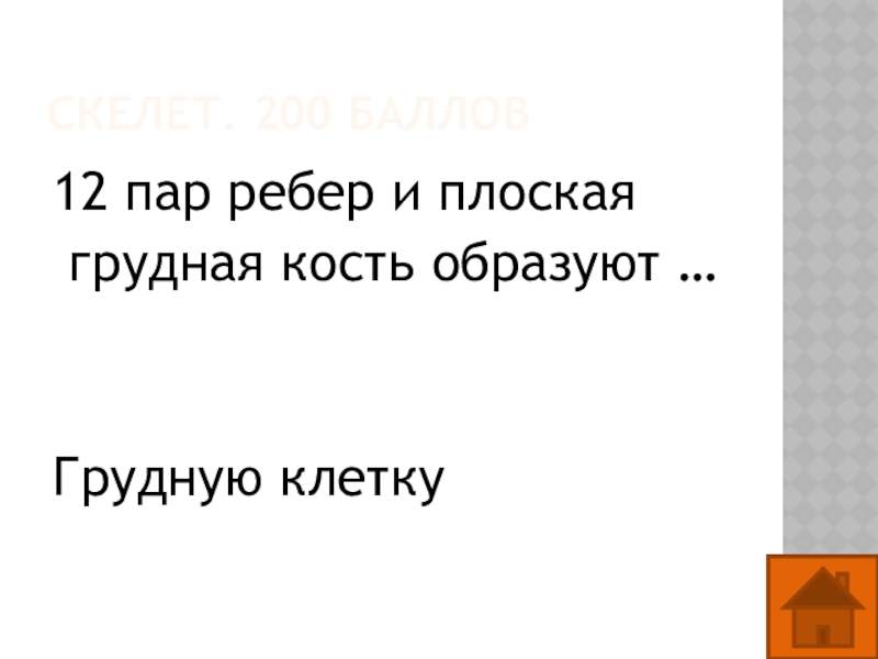 СКЕЛЕТ. 200 БАЛЛОВ12 пар ребер и плоская грудная кость образуют …Грудную клетку