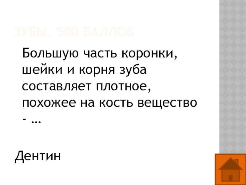 ЗУБЫ. 500 БАЛЛОВ Большую часть коронки, шейки и корня зуба составляет плотное, похожее на кость вещество -