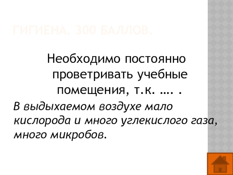 ГИГИЕНА. 300 БАЛЛОВ.Необходимо постоянно проветривать учебные помещения, т.к. …. . В выдыхаемом воздухе мало кислорода и много