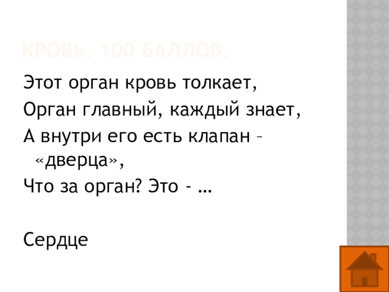 КРОВЬ. 100 БАЛЛОВ.Этот орган кровь толкает,Орган главный, каждый знает,А внутри его есть клапан – «дверца»,Что за орган?