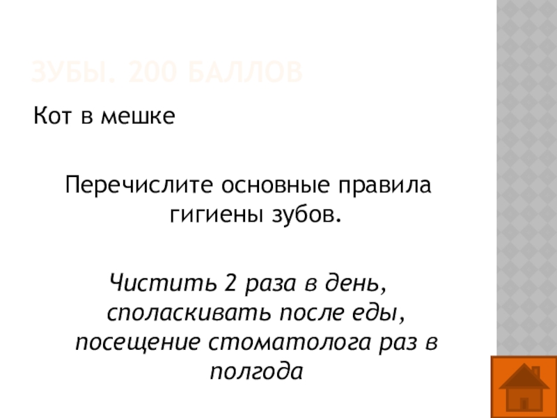 ЗУБЫ. 200 БАЛЛОВКот в мешкеПеречислите основные правила гигиены зубов.Чистить 2 раза в день, споласкивать после еды, посещение