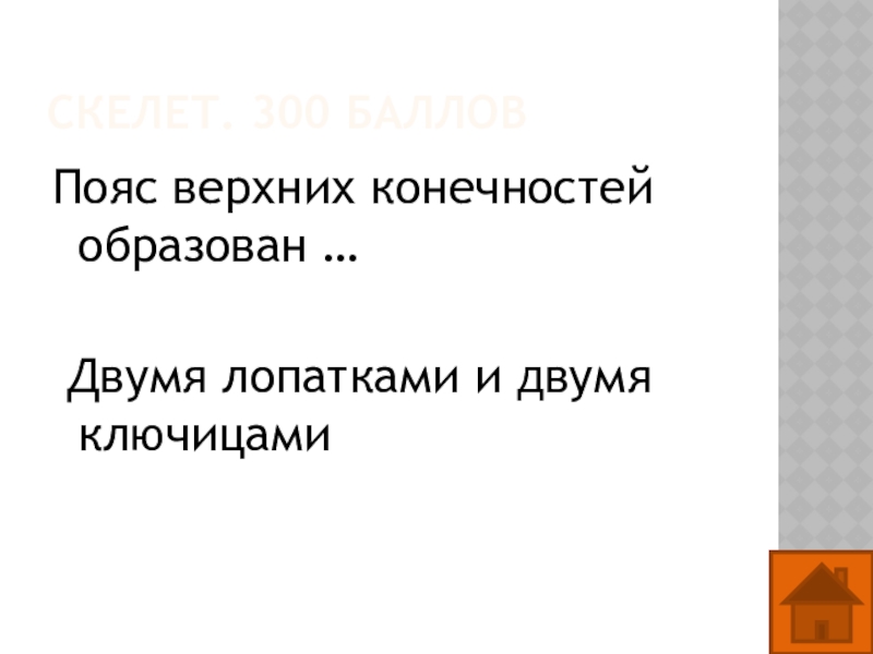 СКЕЛЕТ. 300 БАЛЛОВПояс верхних конечностей образован … Двумя лопатками и двумя ключицами