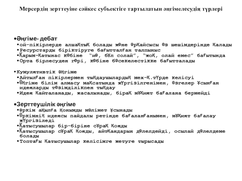 Мерсер сыныпта талқылаудағы дәлелдің үш түрін анықтады. Олар: пікірталас-әңгіме, оқушылар бәсекеге қабілетті; басқа адамдардың көзқарасын қабылдауды қаламайды; кумулятивтік әңгіме; зерттеушілік әңгіме, ұсыныстар жайында күмән туып, қарсы дау айтылып, негізделген дәлел мен сыни тұрғыдан ойлау арқылы жалғасады.