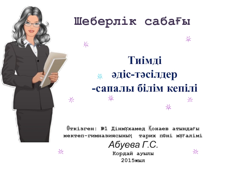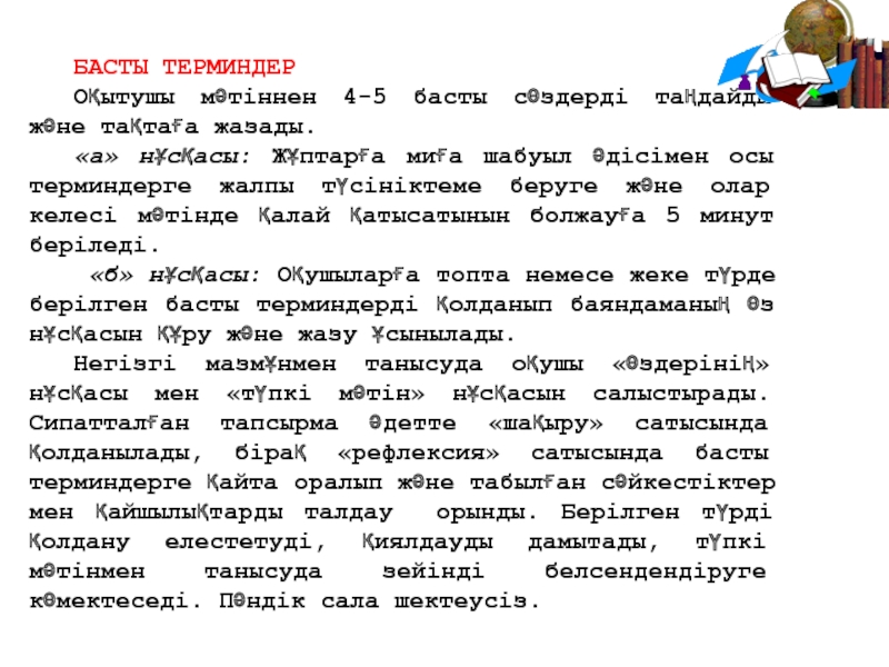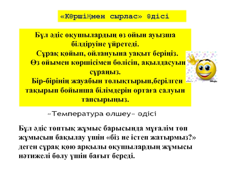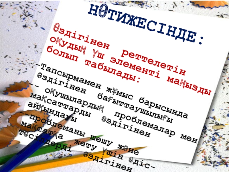 Қолданған әдіс-тәсілдері оқушылардың өздігінен реттелетін оқуын дамытуға ықпал ететіндігі болып табылады.