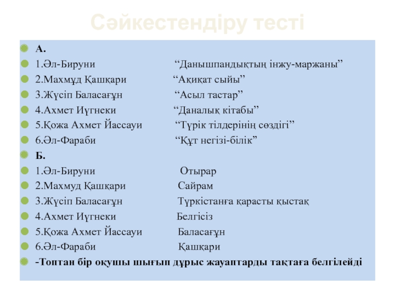 -Топтан бір оқушы шығып дұрыс жауаптарды тақтаға белгілейді