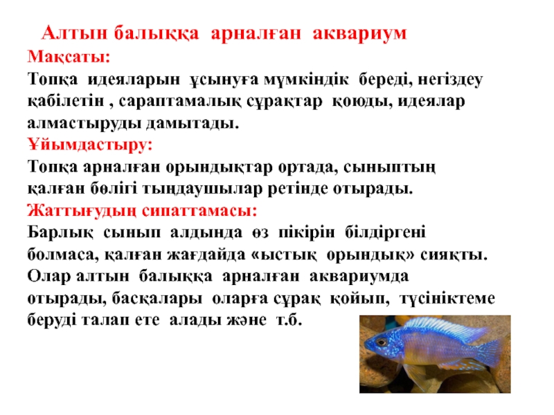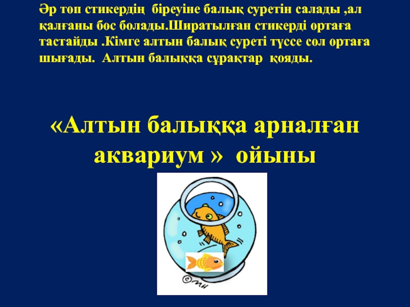 салып, жауабы ұнаған, сабаққа белсене қатысқан кластастарына алтын балықтарын ұсынады.