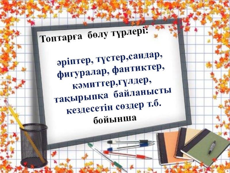 әріптер, түстер,сандар, фигуралар, фантиктер, кәмиттер,гүлдер, тақырыпқа байланысты кездесетін сөздер т.б. бойынша