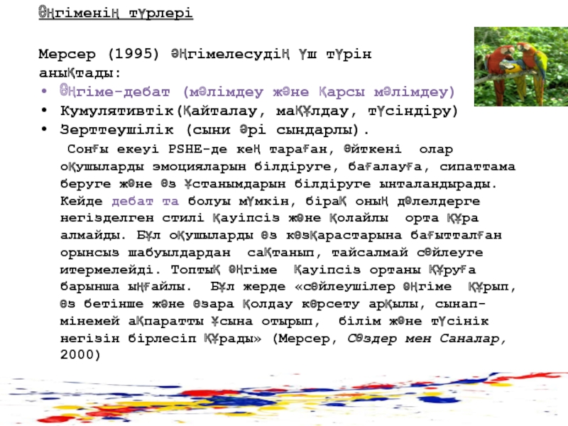 Мерсердің зерттеуіне сәйкес әңгімелесу оқушылардың білім алуының ажырамас бөлшегі болып табылады және әңгімелесудің үш түрі бар. Әңгіме- дебат, топтық әңгіме, зерттеушілік әңгіме