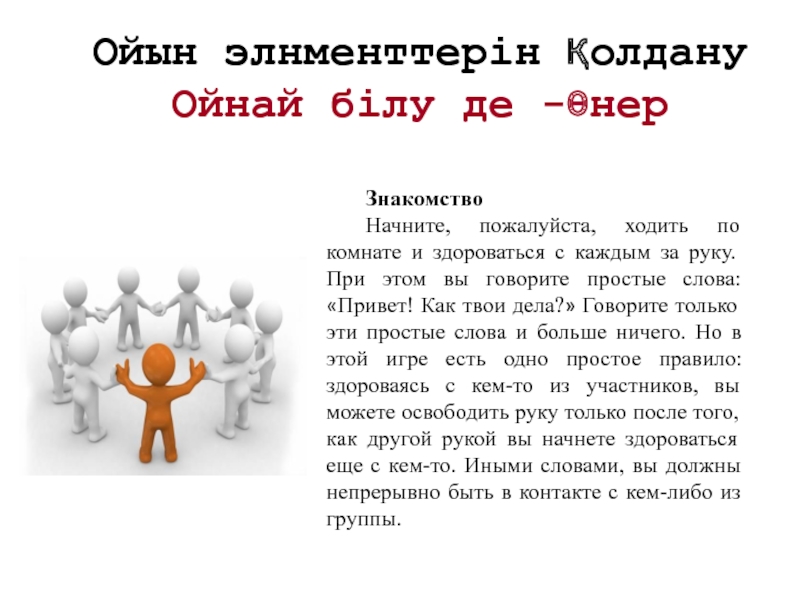 здороваться с каждым за руку. При этом вы говорите простые слова: «Привет! Как твои дела?» Говорите только эти простые слова и больше ничего. Но в этой игре есть одно простое правило: здороваясь с кем-то из участников, вы можете освободить руку только после того, как другой рукой вы начнете здороваться еще с кем-то. Иными словами, вы должны непрерывно быть в контакте с кем-либо из группы.