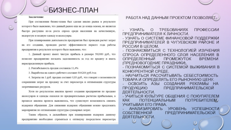 В процессе выполнения работы создаются условия приближенные к профессиональным, что позволяет проанализировать степень соответствия и соотнести требования профессии предпринимателя к человеку, сделать выводы и принять решения в выборе профессии.