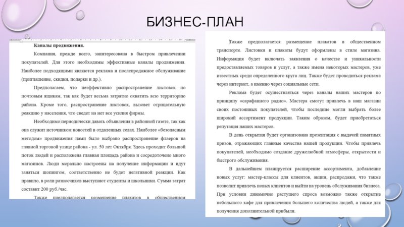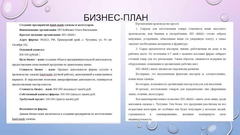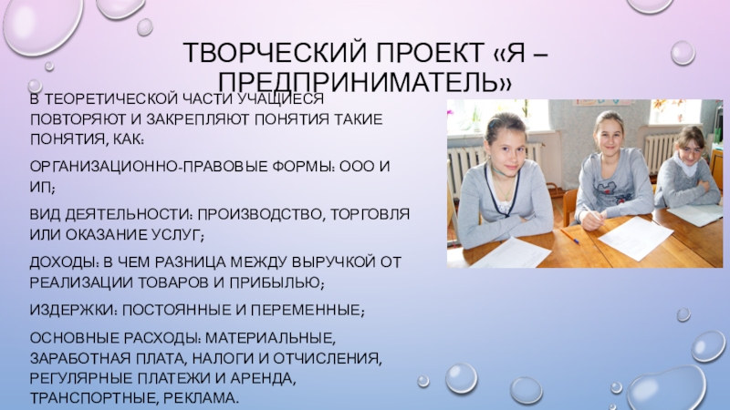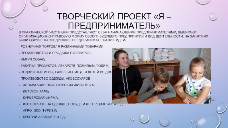 предпринимателями, выбирают организационно-правовую форму своего будущего предприятия и вид деятельности. На занятиях Были озвучены следующие Предпринимательские идеи: