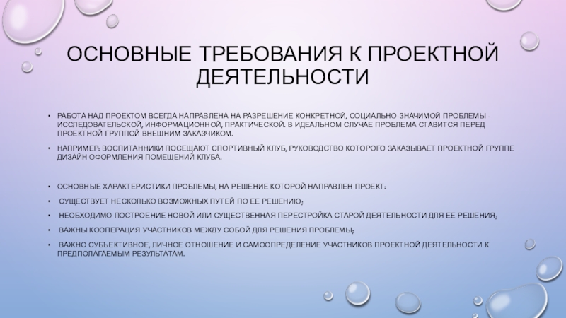 конкретной, социально-значимой проблемы - исследовательской, информационной, практической. В идеальном случае проблема ставится перед проектной группой внешним заказчиком.