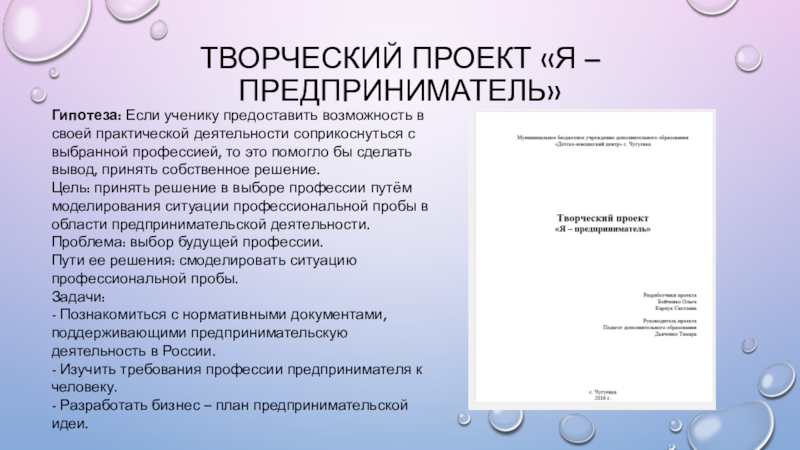 Творческий проект направлен на разработку одного из вариантов выбора профессии - профессиональную пробу.