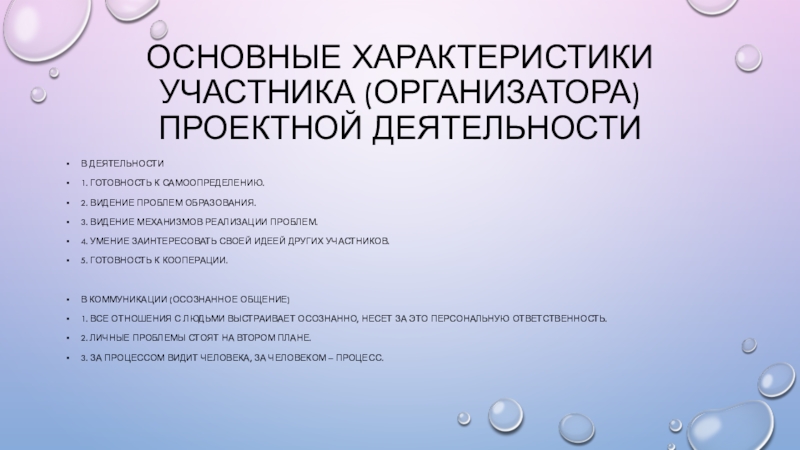 Слайд 11Основные характеристики участника (организатора) проектной деятельности