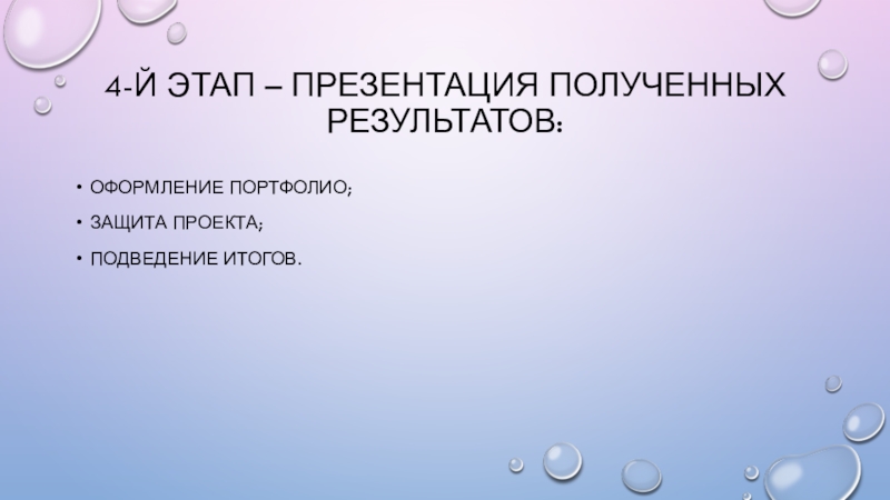 Представление заказчику и (или) общественности готового продукта с обоснованием, что это наиболее эффективное средство решения поставленной проблемы. Осуществление проекта требует на завершающем этапе презентации продукта и защиты самого проекта.