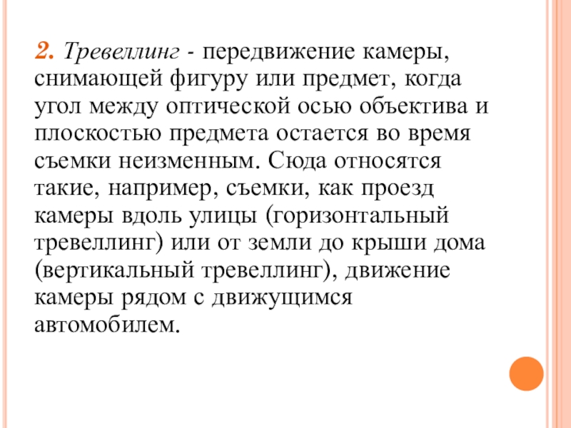 между оптической осью объектива и плоскостью предмета остается во время съемки неизменным. Сюда относятся такие, например, съемки, как проезд камеры вдоль улицы (горизонтальный тревеллинг) или от земли до крыши дома (вертикальный тревеллинг), движение камеры рядом с движущимся автомобилем.