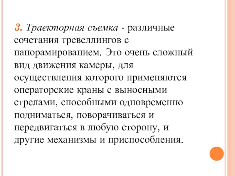 3. Траекторная съемка - различные сочетания тревеллингов с панорамированием. Это очень сложный вид движения камеры, для осуществления