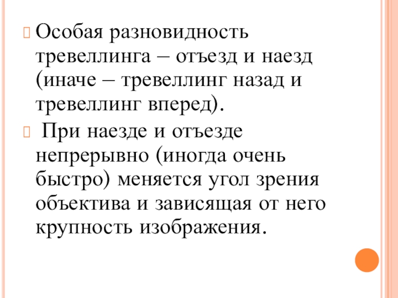 Слайд 4Особая разновидность тревеллинга – отъезд и наезд (иначе – тревеллинг назад