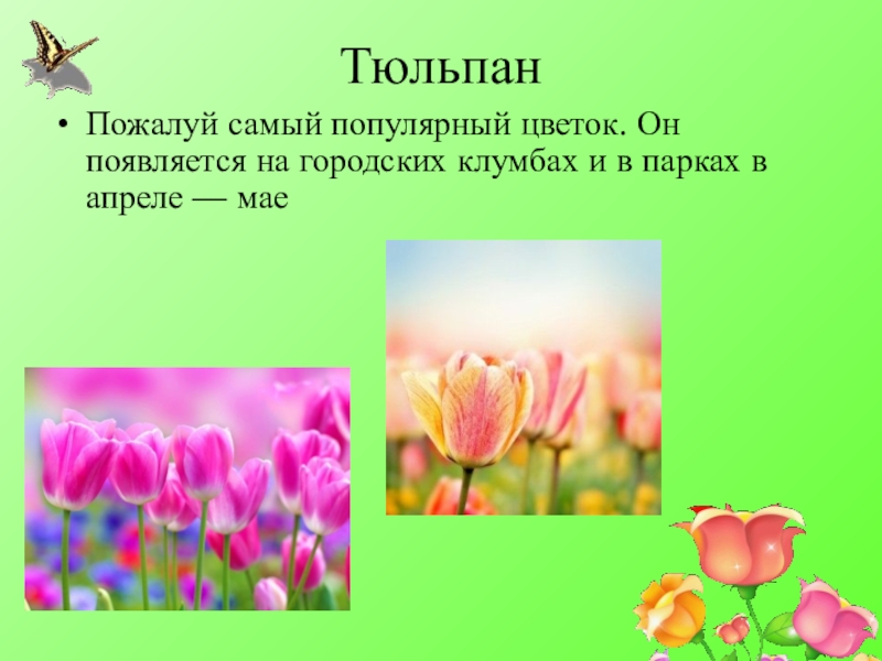 ТюльпанПожалуй самый популярный цветок. Он появляется на городских клумбах и в парках в апреле — мае