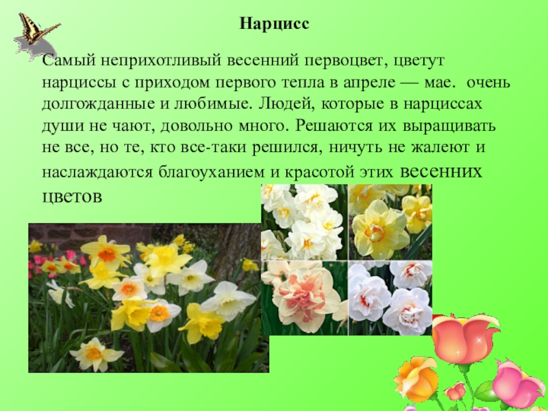 апреле — мае.  очень долгожданные и любимые. Людей, которые в нарциссах души не чают, довольно много. Решаются их выращивать не все, но те, кто все-таки решился, ничуть не жалеют и наслаждаются благоуханием и красотой этих весенних цветов