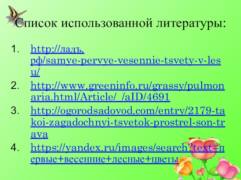 Список использованной литературы:http://ладъ.рф/samye-pervye-vesennie-tsvety-v-lesu/http://www.greeninfo.ru/grassy/pulmonaria.html/Article/_/aID/4691http://ogorodsadovod.com/entry/2179-takoi-zagadochnyi-tsvetok-prostrel-son-travahttps://yandex.ru/images/search?text=первые+весенние+лесные+цветы
