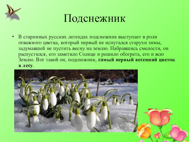 ПодснежникВ старинных русских легендах подснежник выступает в роли отважного цветка, который первый не испугался старухи зимы, задумавшей не пустить весну на землю. Набравшись смелости, он распустился, его заметило Солнце и решило обогреть, его и всю Землю.