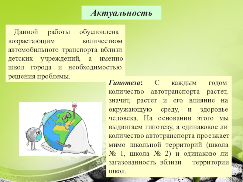 Гипотеза: С каждым годом количество автотранспорта растет, значит, растет и его влияние на окружающую среду, и здоровье человека. На основании этого мы выдвигаем гипотезу, а одинаковое ли количество автотранспорта проезжает мимо школьной территорий (школа № 1, школа № 2) и одинаково ли загазованность вблизи территории школ.