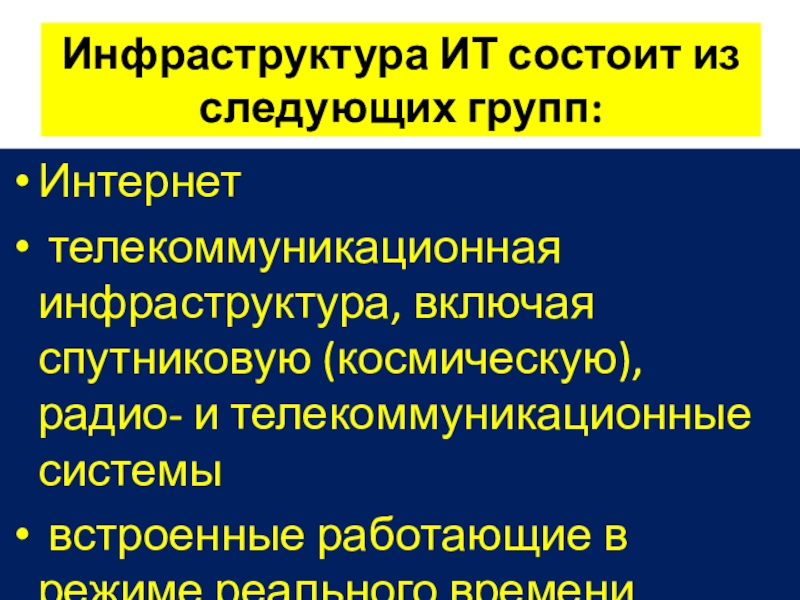Инфраструктура ИТ состоит из следующих групп:Интернет телекоммуникационная инфраструктура, включая спутниковую (космическую), радио- и телекоммуникационные системы встроенные работающие