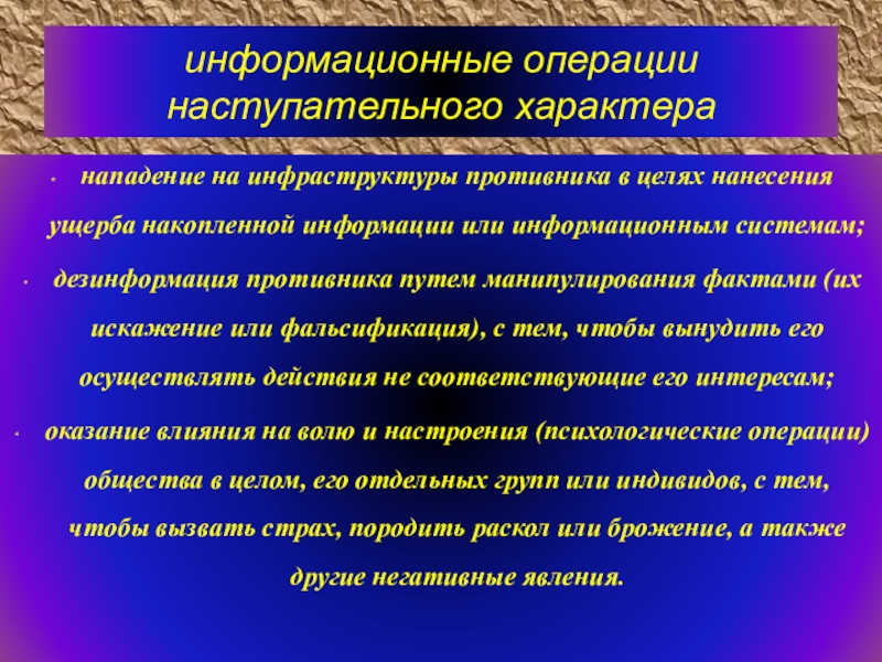 информационные операции наступательного характеранападение на инфраструктуры противника в целях нанесения ущерба накопленной информации или информационным системам;дезинформация противника