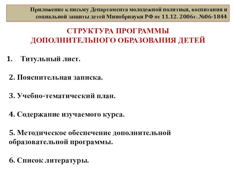 молодежной политики, воспитания и социальной поддержки детей Министерства образования и науки РФ от 11 декабря 2006г. №06-1844 «О примерных требованиях к программам дополнительного образования детей»(Примерные требования к программам дополнительного образования детей )
