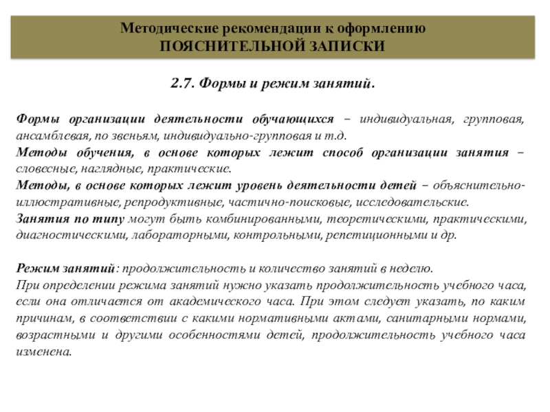 При определении режима занятий нужно указать продолжительность учебного часа, если она отличается от академического часа. При этом следует указать, по каким причинам, в соответствии с какими нормативными актами, санитарными нормами, возрастными и другими особенностями детей, продолжительность учебного часа изменена.