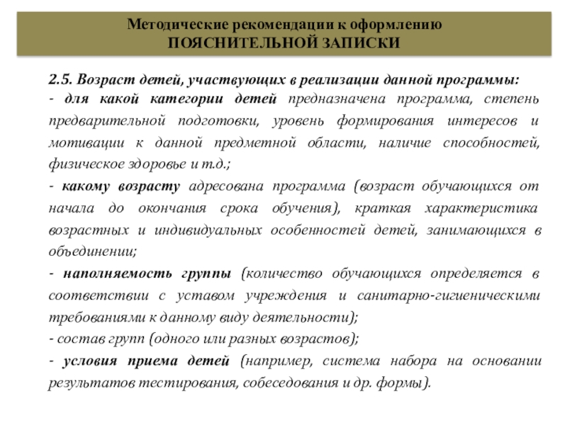 - для какой категории детей предназначена программа, степень предварительной подготовки, уровень формирования интересов и мотивации к данной предметной области, наличие способностей, физическое здоровье и т.д.;