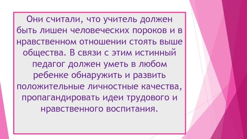 Слайд 21Они считали, что учитель должен быть лишен человеческих пороков и в
