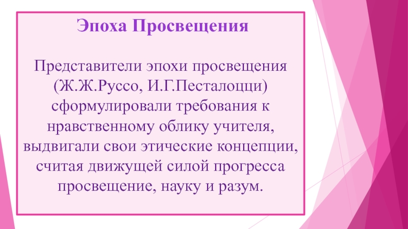 нравственному облику учителя, выдвигали свои этические концепции, считая движущей силой прогресса просвещение, науку и разум.