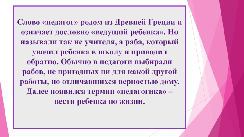 Слово «педагог» родом из Древней Греции и означает дословно «ведущий ребенка».