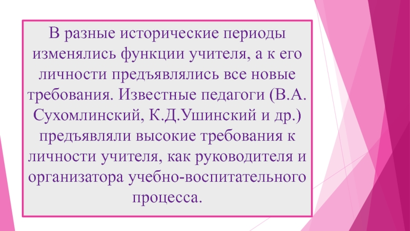 предъявлялись все новые требования. Известные педагоги (В.А.Сухомлинский, К.Д.Ушинский и др.) предъявляли высокие требования к личности учителя, как руководителя и организатора учебно-воспитательного процесса.