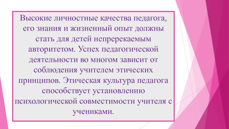 Слайд 25Высокие личностные качества педагога, его знания и жизненный опыт должны стать