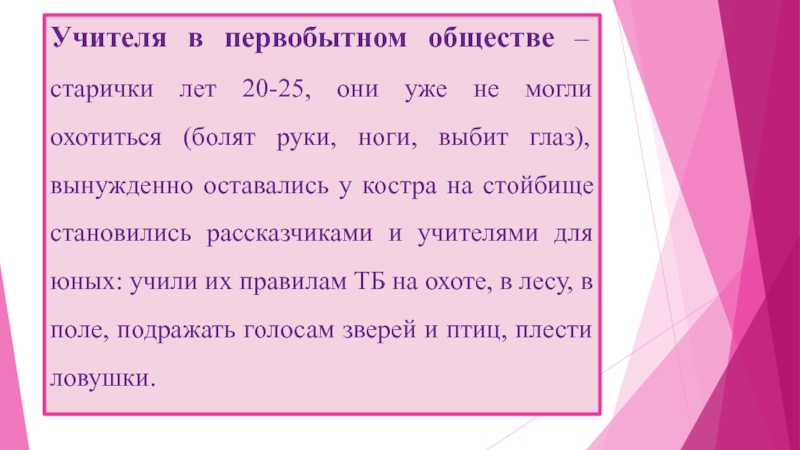 Слайд 3Учителя в первобытном обществе – старички лет 20-25, они уже не