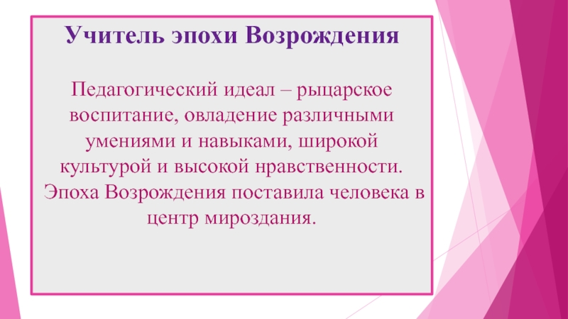 Педагогический идеал – рыцарское воспитание, овладение различными умениями и
